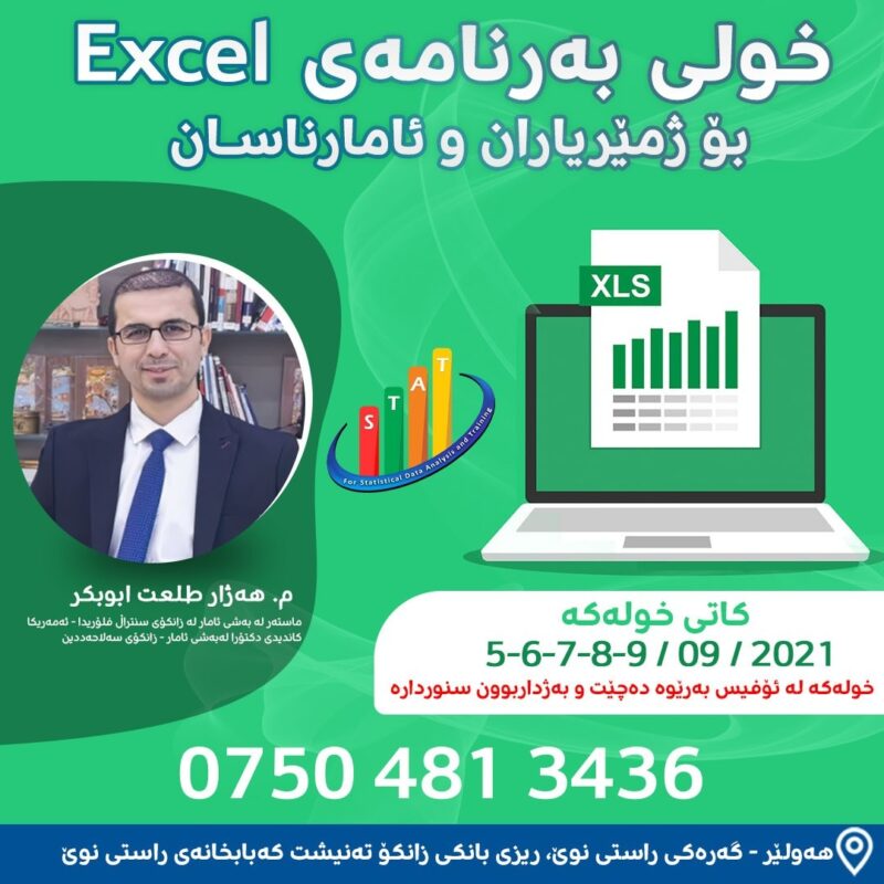 The STAT Organization for Statistical Data Analysis and Training organized a training course titled “Microsoft Excel Program for Accountants and Statisticians” on September 5, 2021, delivered by Asst. Prof. Dr. Hazhar Blbas. The workshop offered academically grounded insights into personal development, reflecting STAT’s commitment to high-quality training and professional excellence.